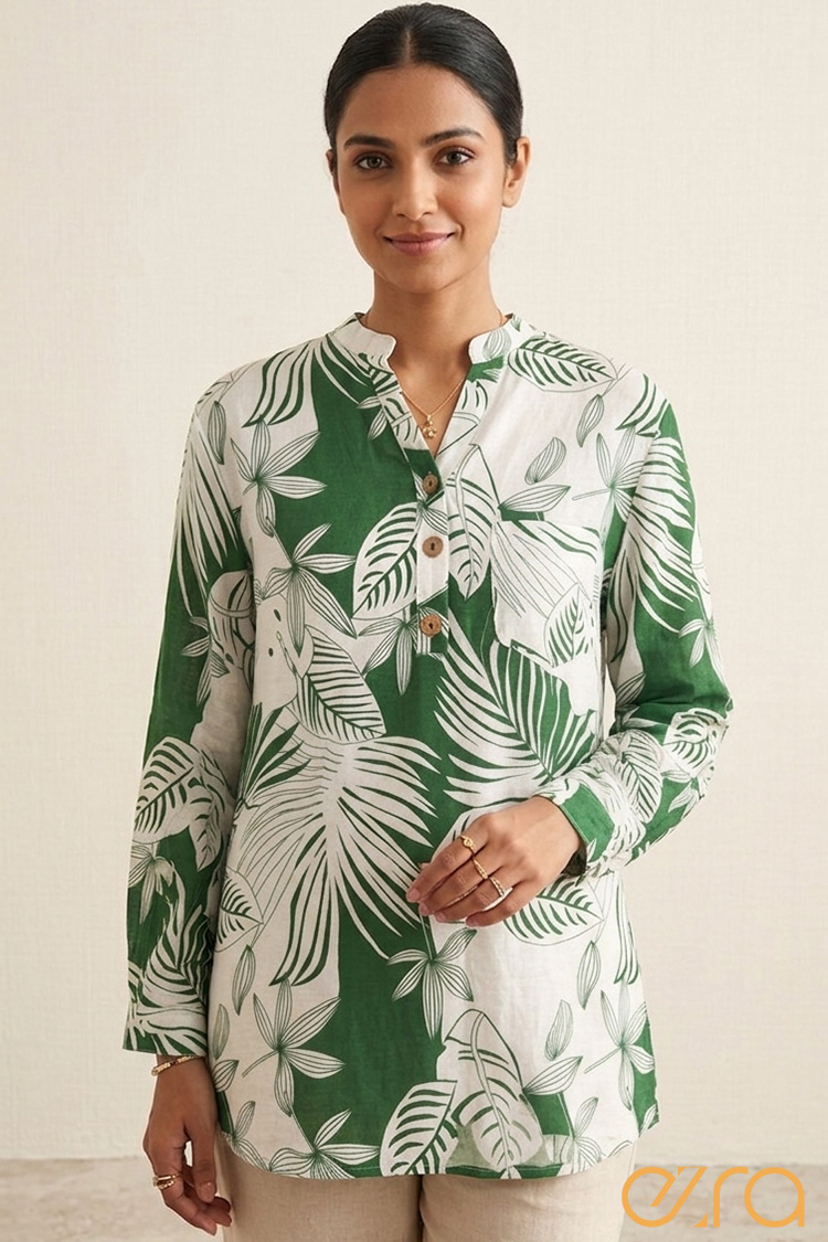 Refresh your wardrobe with the lush, tropical energy of the Ezra Verdant Palm Leaf Tunic. This eye-catching top features a bold botanical print of oversized palm fronds in a striking emerald green against a crisp white background, perfect for bringing a vacation-ready feel to your everyday style.